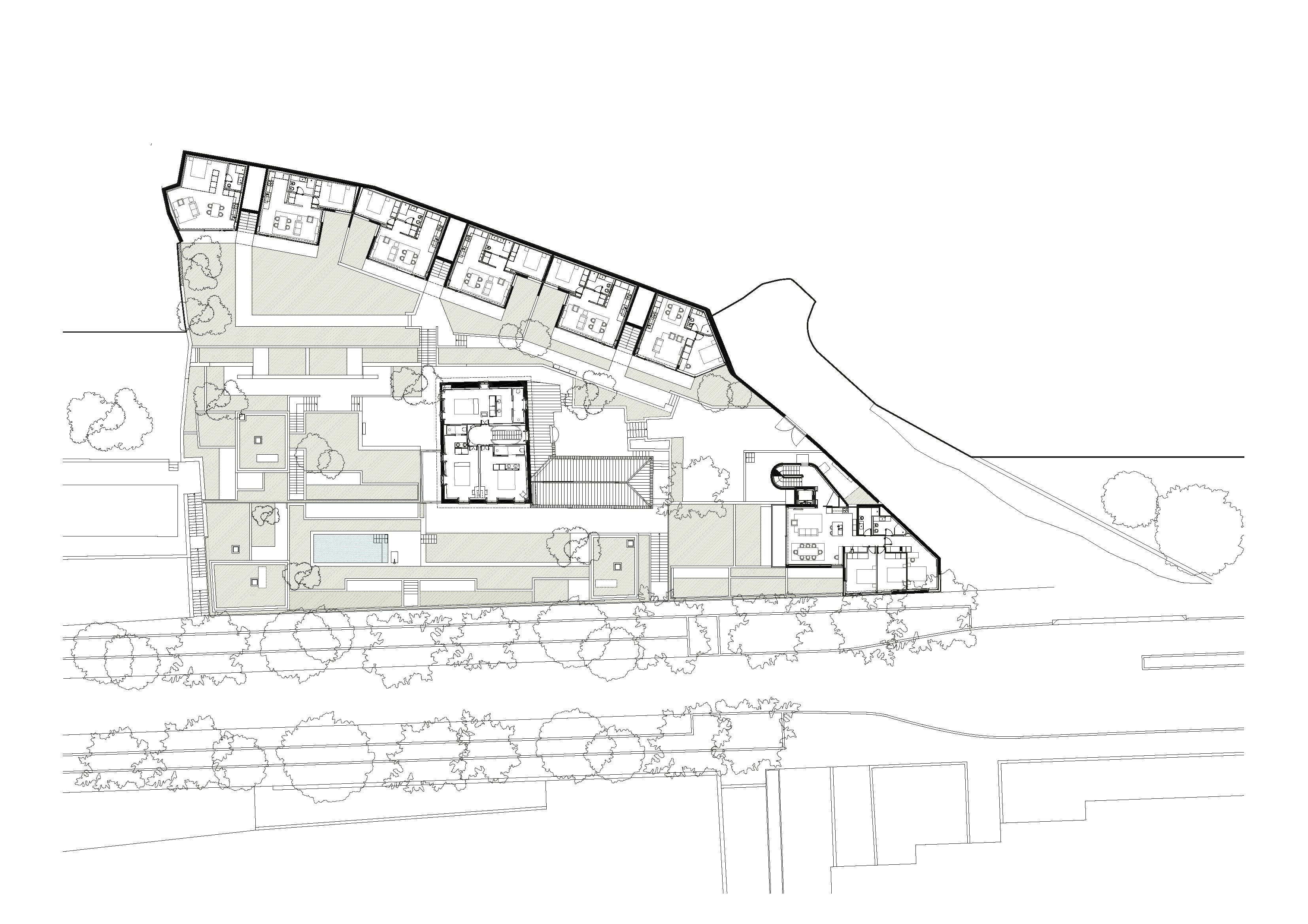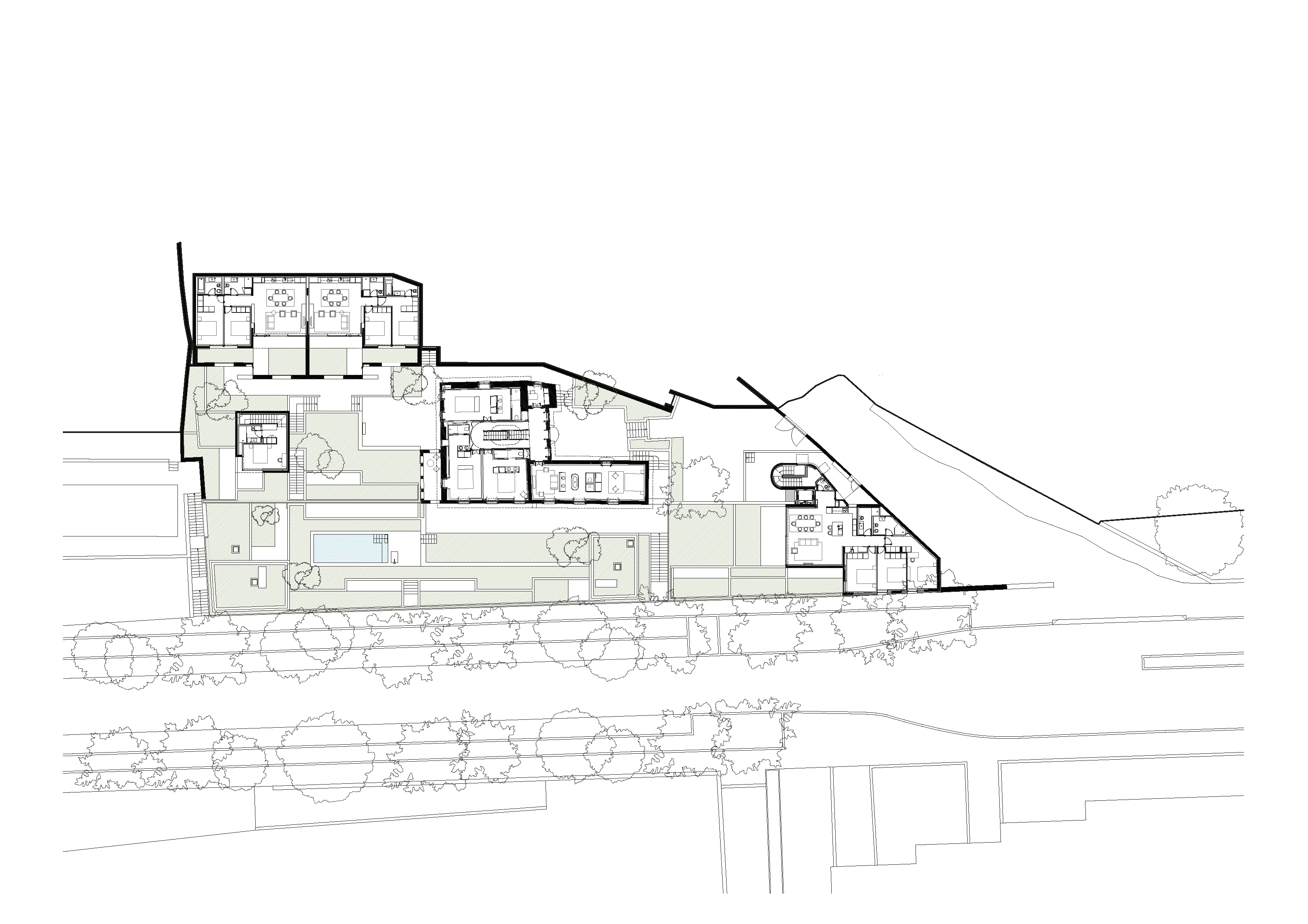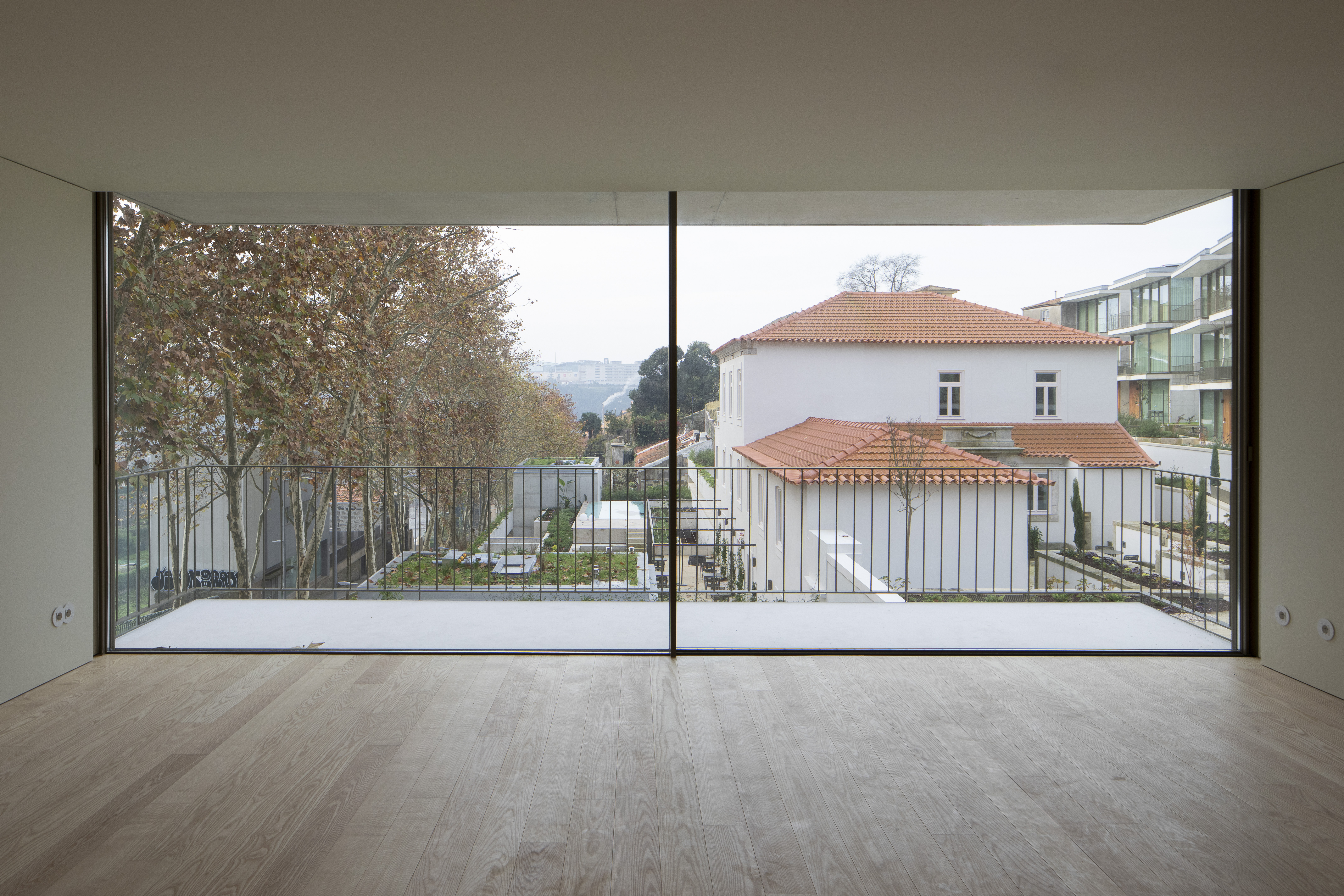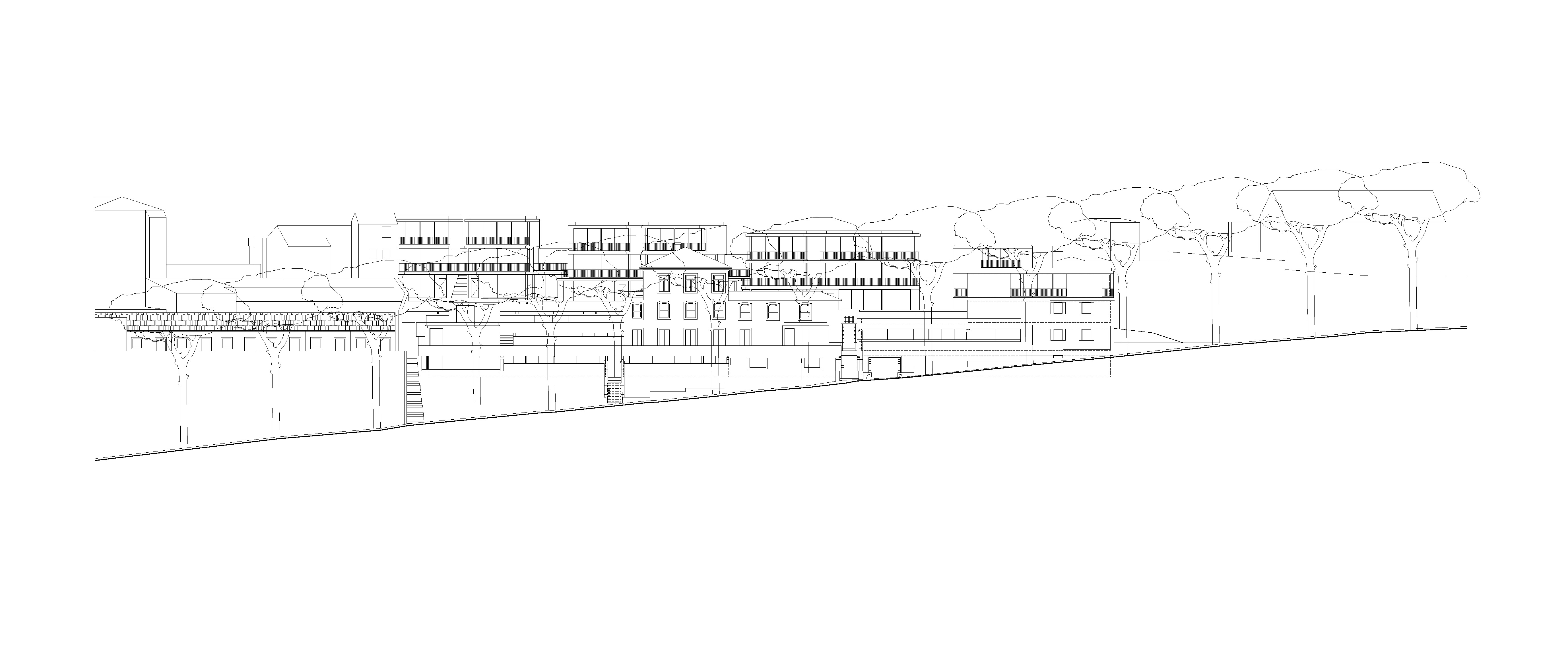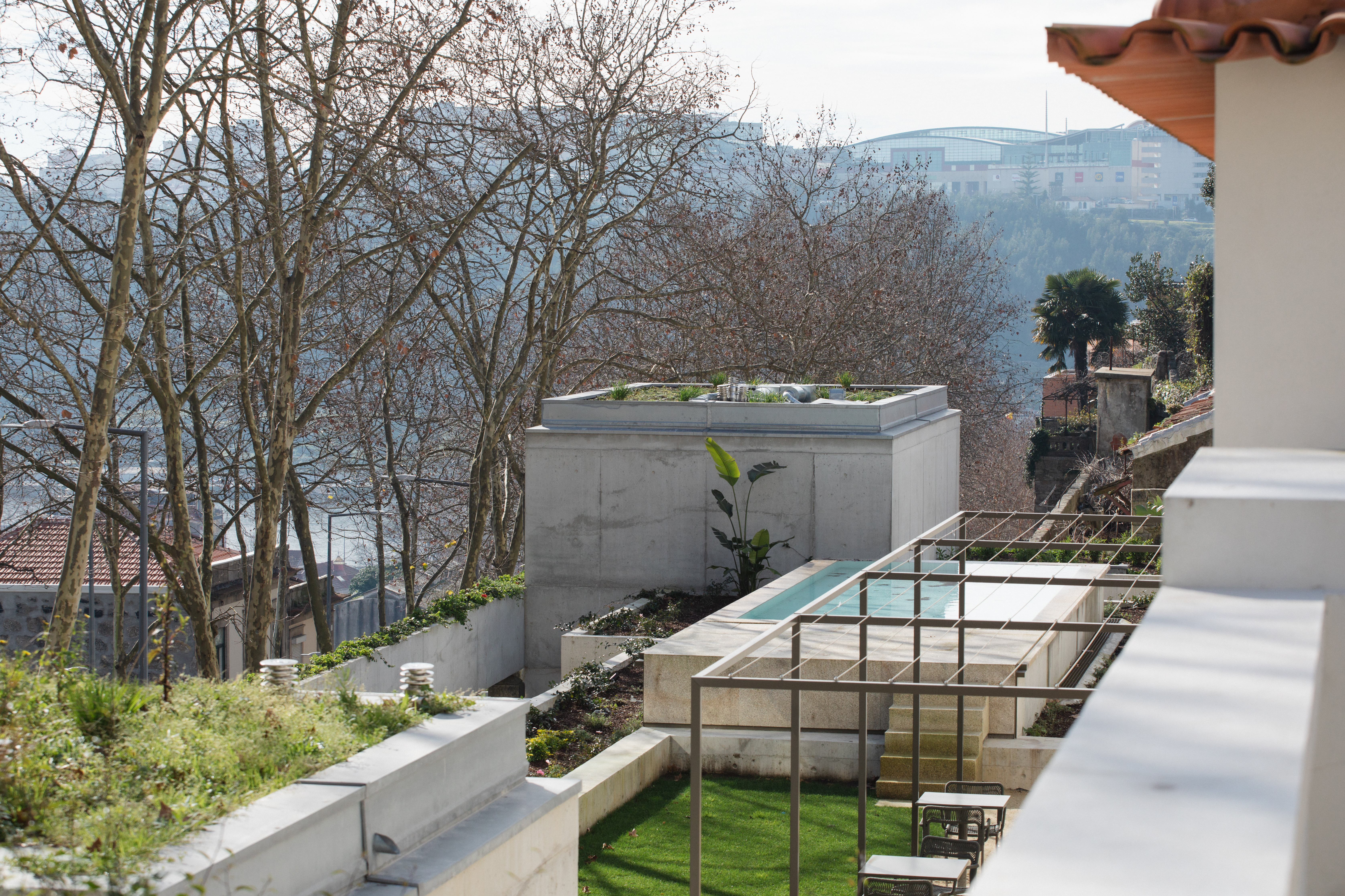 The Dom Pedro V project merges the sensitive restoration of a historic manor with the integration of 25 contemporary housing units on a uniquely contoured urban site in Porto. Responding to the character of the surrounding streets and the natural topography, the design redefines the granite terraces and retaining walls, anchoring new volumes within a layered landscape. The pre-existing manor is carefully rehabilitated and repurposed as a small-scale hotel with seven suites, offering temporary accommodation and maintaining a programmatic dialogue with the new dwellings. Its lower level opens to communal living areas and shared outdoor spaces, including a pool nestled within the condominium grounds.