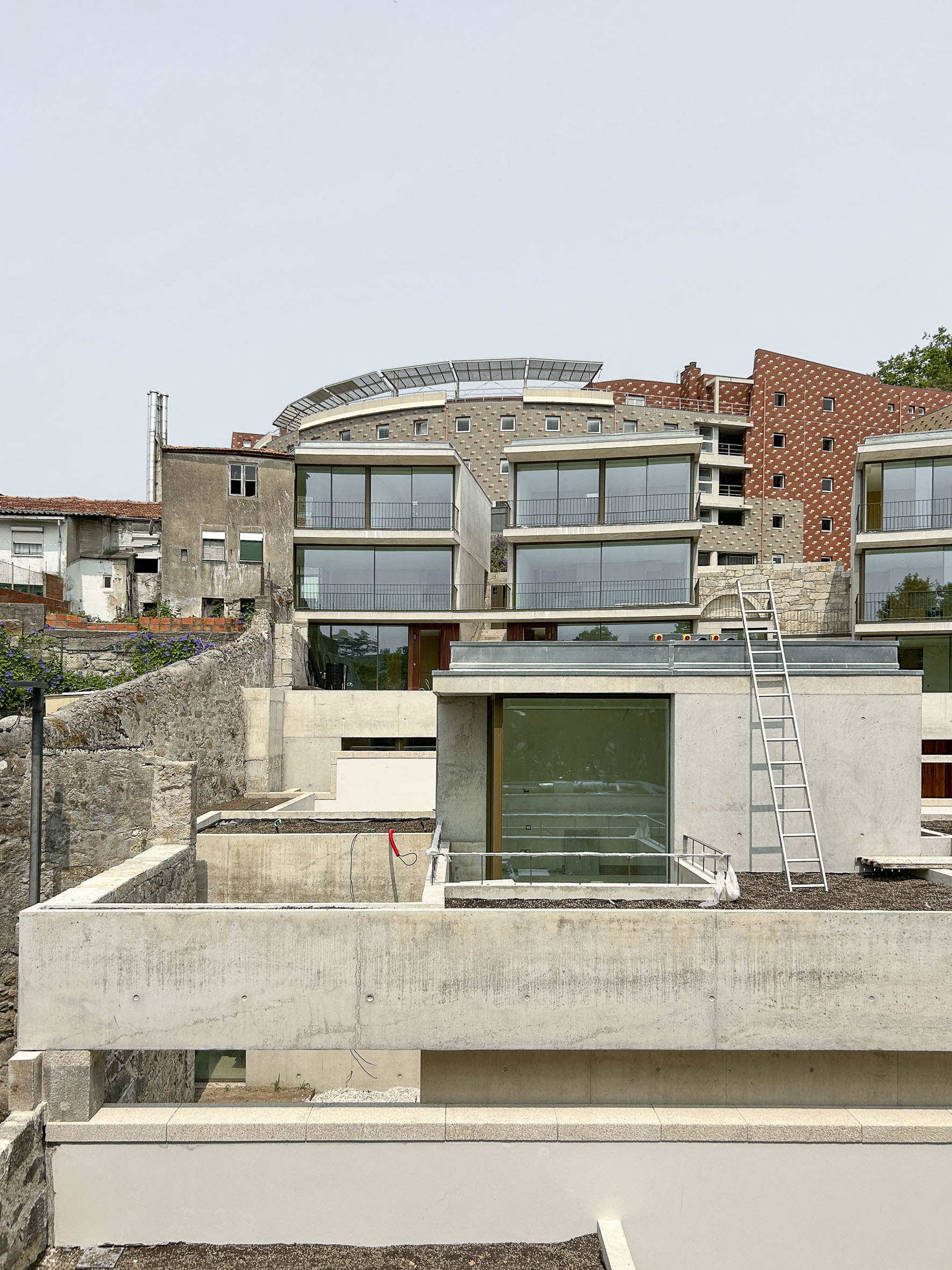 A documented about the construction process of dpv project through a series of photographs. These images capture the transformation of the site from its initial stages to the completion of the residences, highlighting the integration of contemporary architecture with the existing historical elements. The photographs showcase the careful restoration of the central manor house, and the construction of 25 new residential units arranged across terraced land, respecting the site's topography and incorporating existing granite walls. This photographic work provides a visual narrative of the project's development, emphasizing the harmony between old and new structures and the thoughtful design that characterizes the dpv residences.