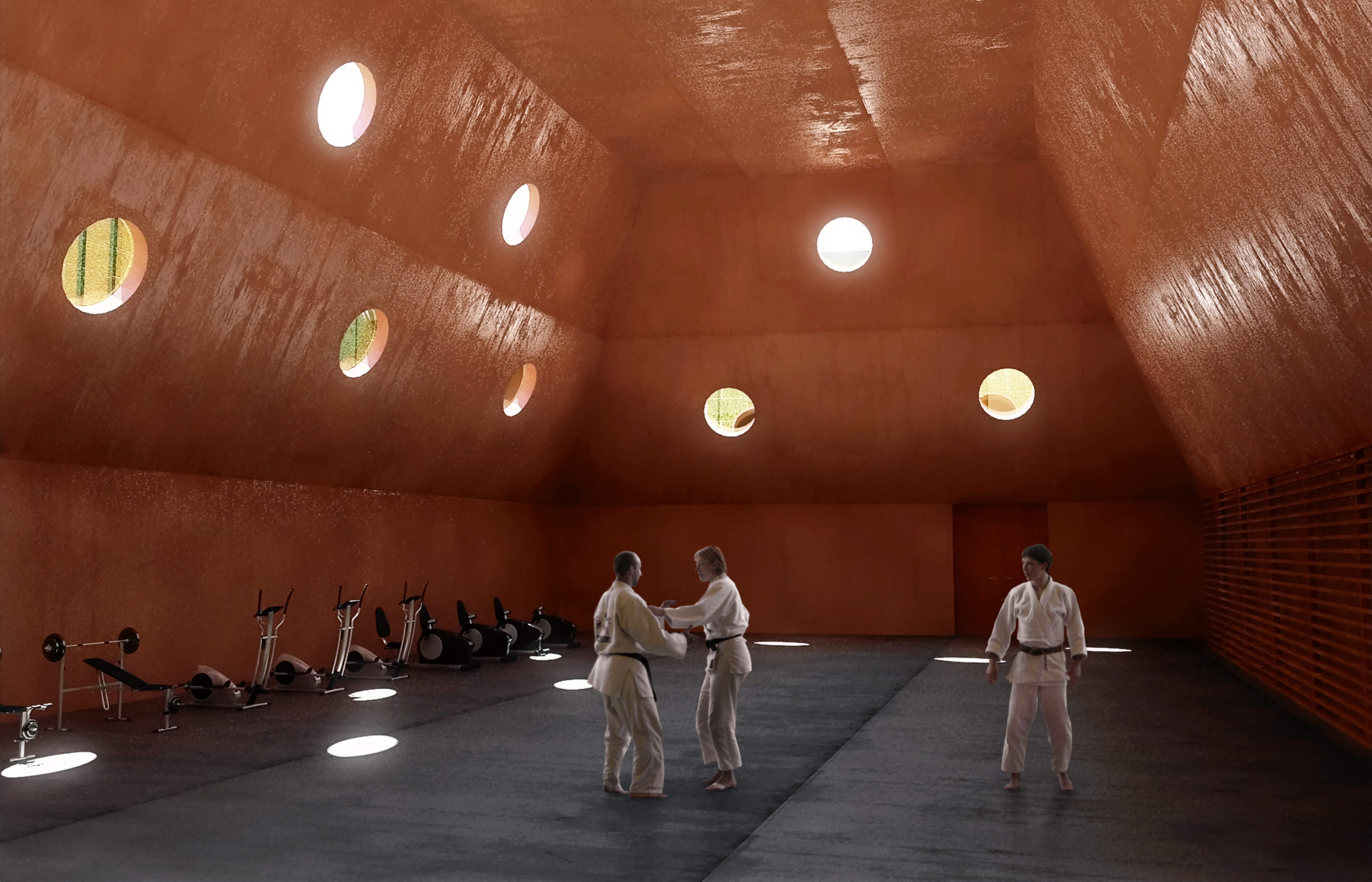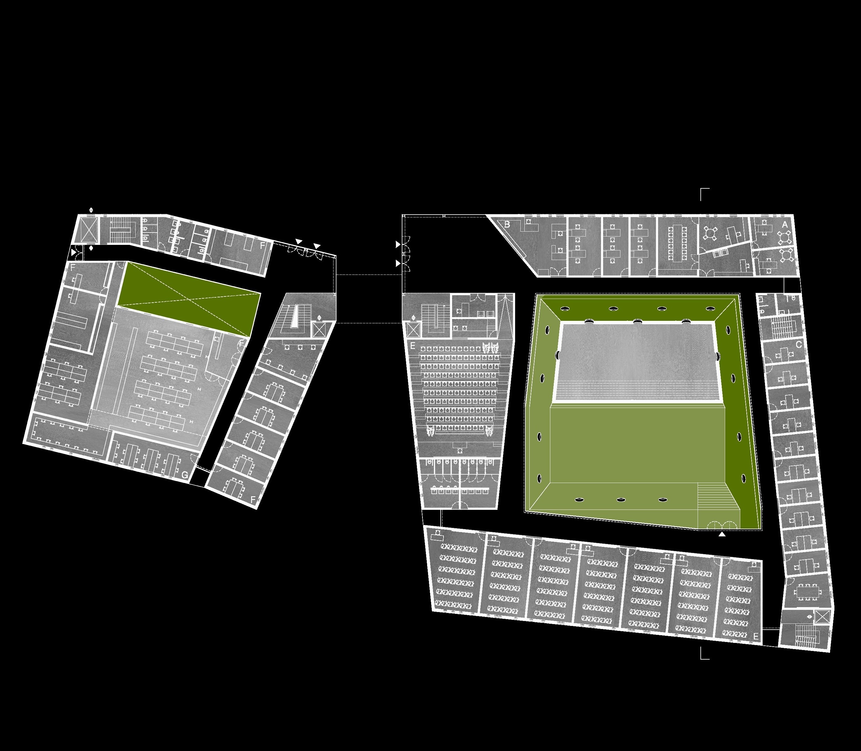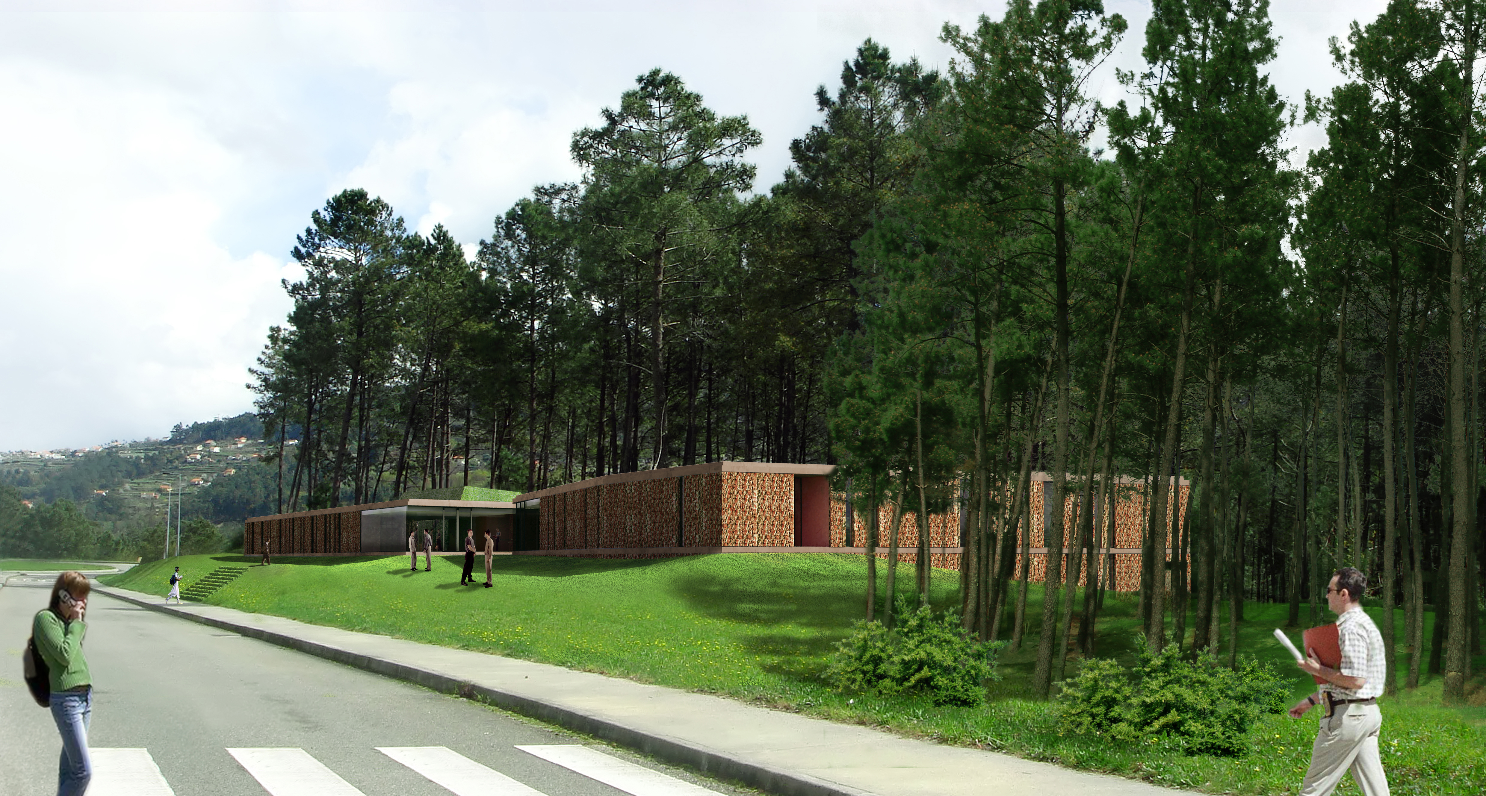 This proposal for the new Sports School building in Melgaço was developed aiming to reinforce the town’s identity as a national hub for sports training. The project balances functionality and landscape integration, creating a building that opens toward the surrounding natural context while organizing training, academic, and support spaces with clarity and flexibility. The design responds to the topography and climate, offering an architecture that is both robust and adaptable to future needs. The steeply sloped terrain is embraced in its natural geometry and form. The high density of pine trees on the site and in its surroundings characterizes the place, and their preservation and integration into the project are fundamental to the structure and final outcome of the proposal. The idea of the intervention is to geometrize the “bark” and differentiate the “core” through a green, natural element: a rectilinear volume wraps around the organic form. Two green masses rise up, establishing a strong and direct relationship with the nature of the site. In the natural development of the project, the “green” is wrapped by the pine tree’s “bark.”