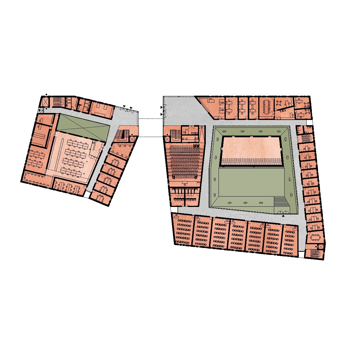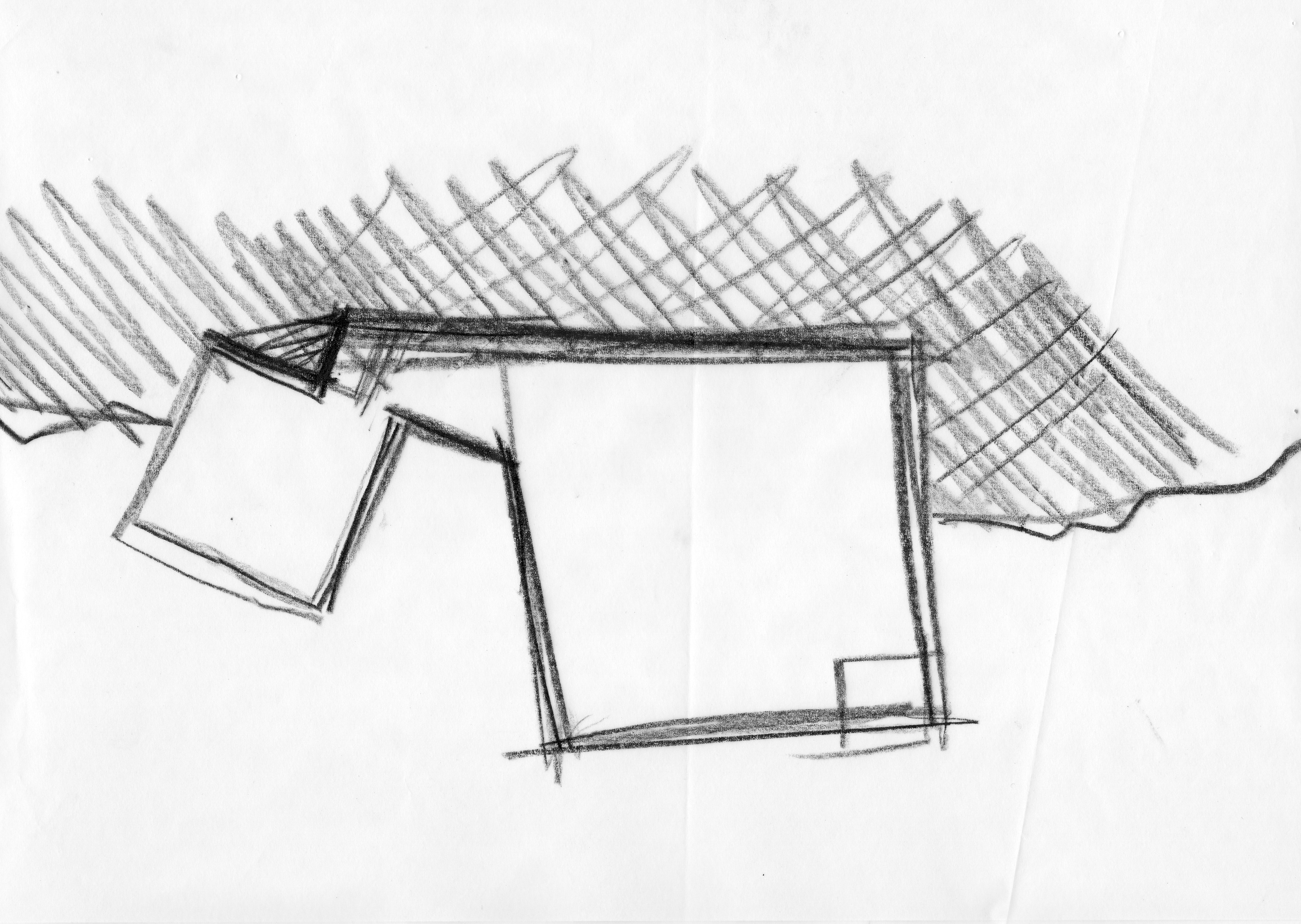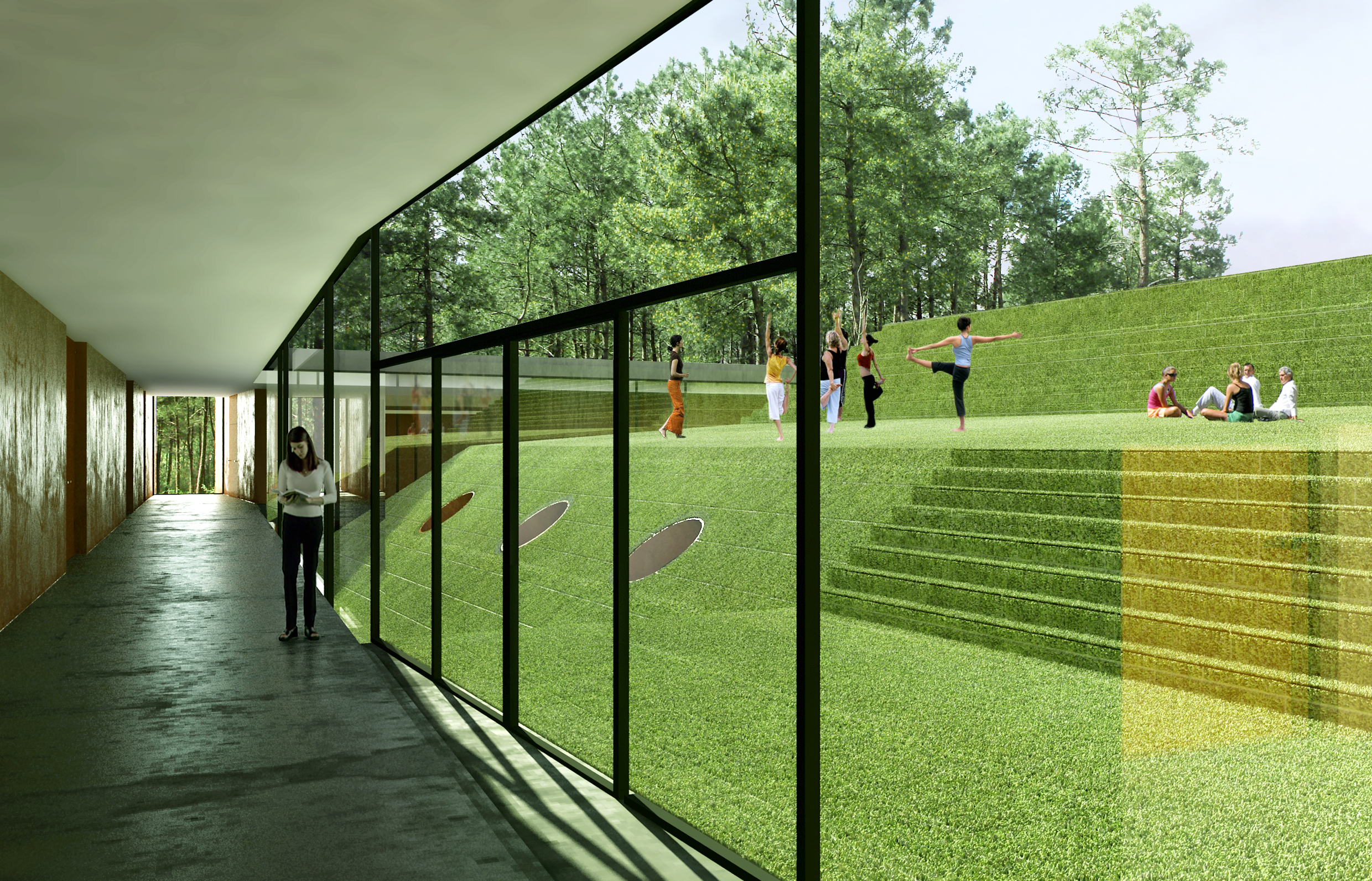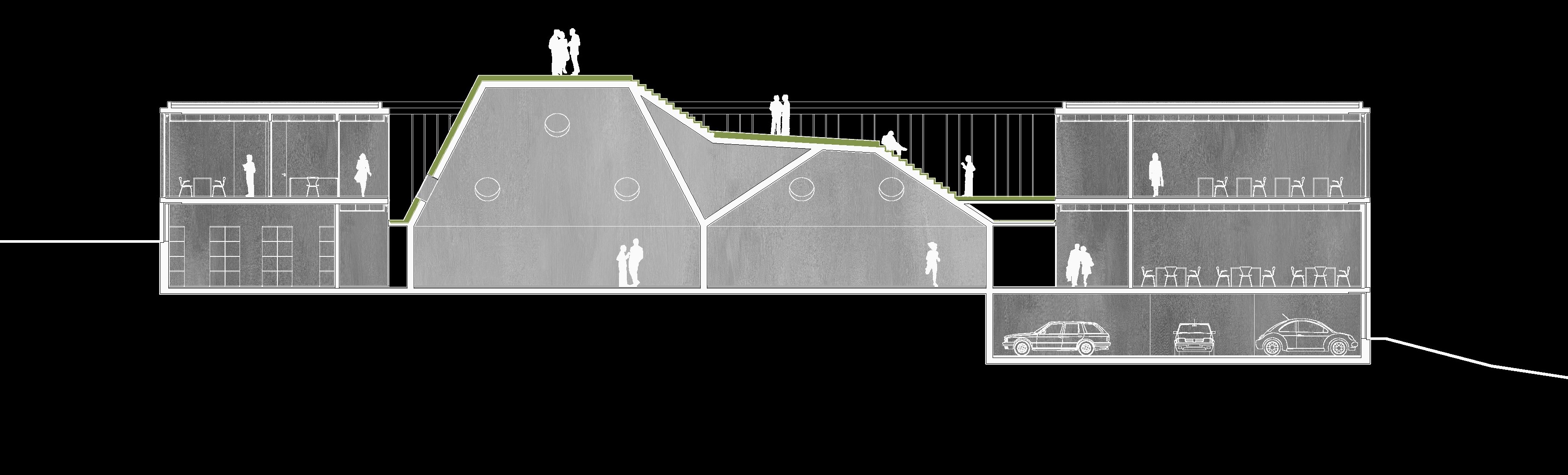 This proposal for the new Sports School building in Melgaço was developed aiming to reinforce the town’s identity as a national hub for sports training. The project balances functionality and landscape integration, creating a building that opens toward the surrounding natural context while organizing training, academic, and support spaces with clarity and flexibility. The design responds to the topography and climate, offering an architecture that is both robust and adaptable to future needs. The steeply sloped terrain is embraced in its natural geometry and form. The high density of pine trees on the site and in its surroundings characterizes the place, and their preservation and integration into the project are fundamental to the structure and final outcome of the proposal. The idea of the intervention is to geometrize the “bark” and differentiate the “core” through a green, natural element: a rectilinear volume wraps around the organic form. Two green masses rise up, establishing a strong and direct relationship with the nature of the site. In the natural development of the project, the “green” is wrapped by the pine tree’s “bark.”