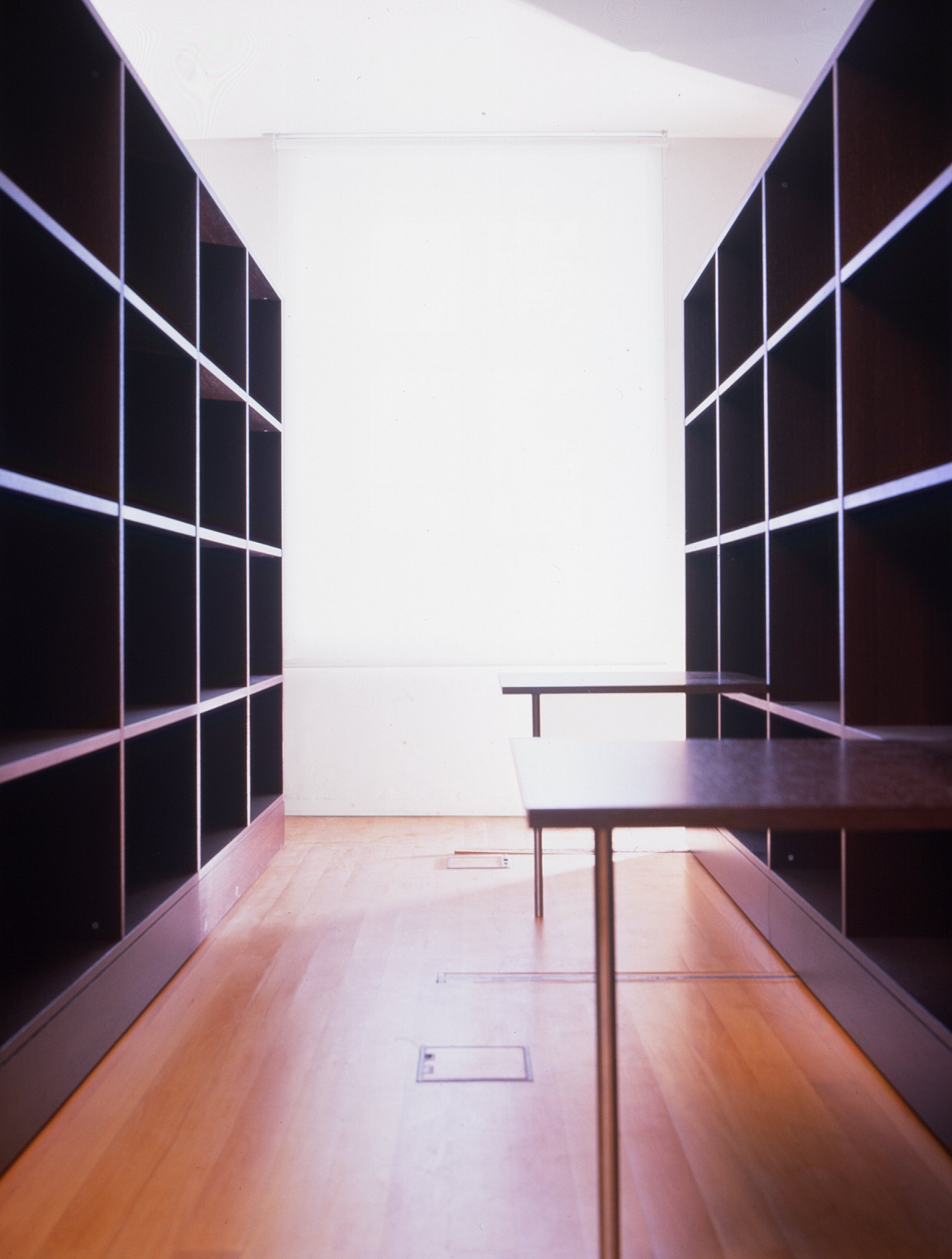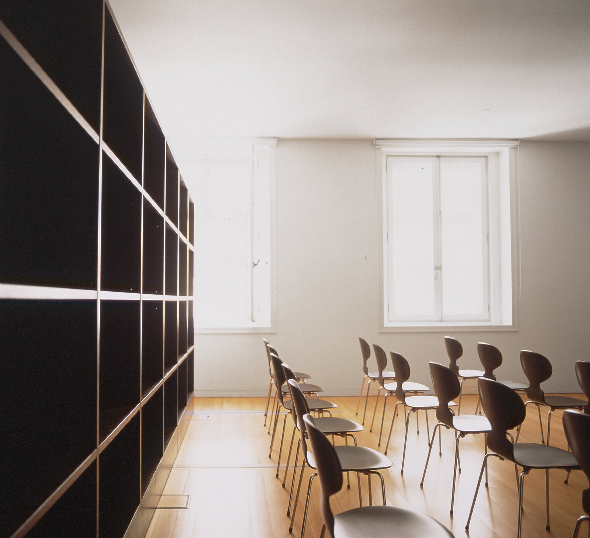 An office space in downtown Lisbon is organized into three work areas: secretariat, private office, reading/library, and a small auditorium, all connected by satinwood flooring The partitioning between different spaces is done with black wenge wood bookshelves up to a height of 2.20 meters, always allowing a visual reading of the entire office area The separation between the reception and the private office is defined by a translucent glass wall, also 2.20 meters high, which extends perpendicularly from the black wood cabinet, allowing natural light to reach the entrance and secretariat area By sliding one of the bookshelves approximately 2.00 meters, the reading/library area can be concealed, transforming the meeting room into a small auditorium. At the top of the bookshelves, two lines of “cool” lighting highlight the direction of natural light entering the office.