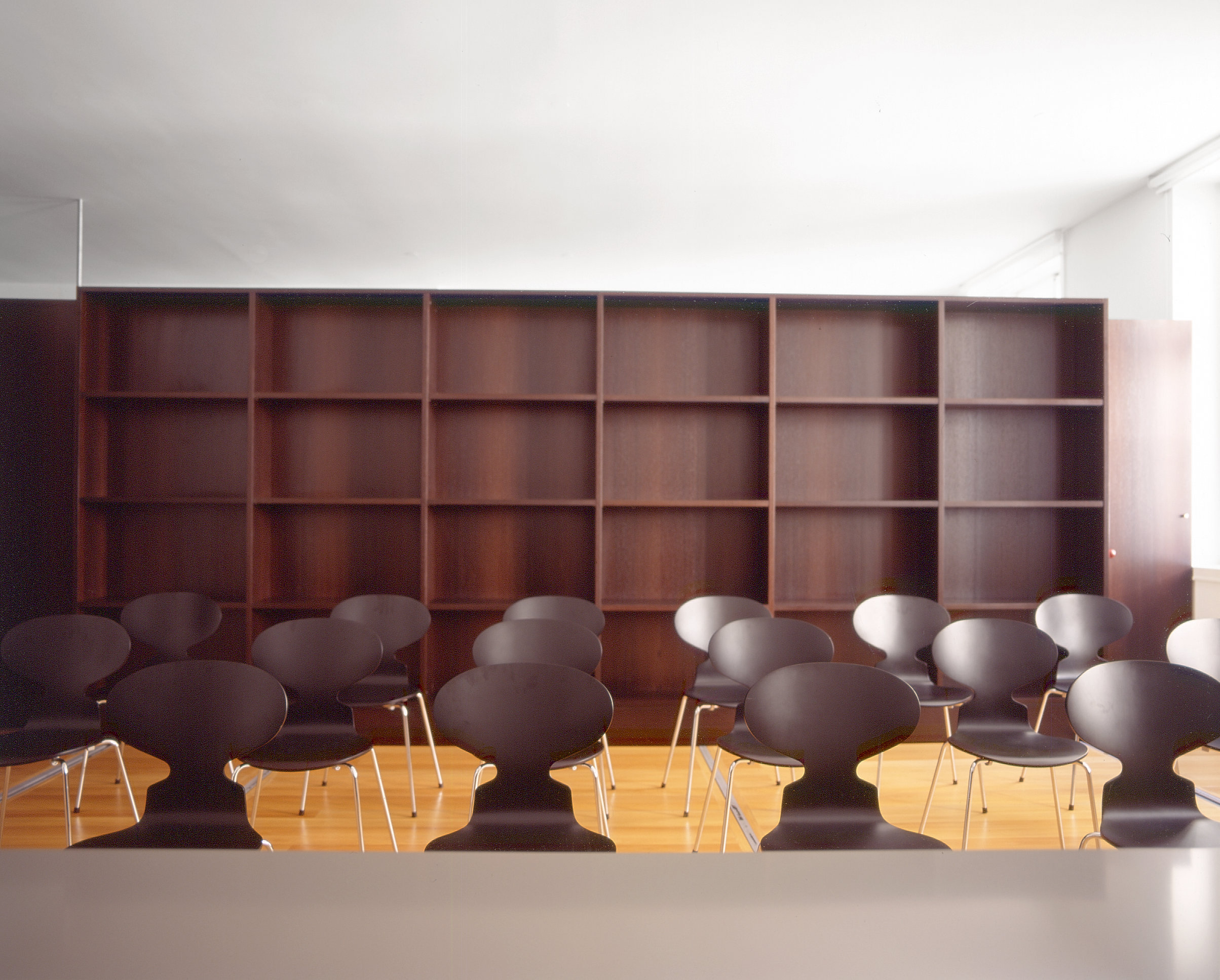 Furniture: In the meeting room, “Less” tables and “Ant” chairs by Fritz Hansen; desks from the “Harpa” line with glass tops; and in the reception area, black leather “PK” armchairs.